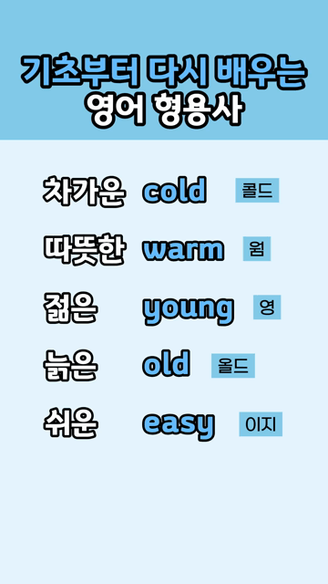 이 카테고리 글 더보기 쉬운 형용사부터 다시 시작하는 영어 영어초보 필수 생활 영어단어 초보가 먼저 배우는 영어 기본 동사 왕초보도 읽을 수 있는 쉬운 영어단어 다시 영어 도전할 때 먼저 배우는 형용사 초보를 위한 기초 생활 단어 초보를 위한 핵심 동사 모음 처음 영어 배우는 기초 필수 단어 이번주 Top 5 분실 영어단어 모음 주제별 영단어 관리자 - 2026-03-26 기초부터 쉽게 배우는 영단어 필수 형용사 동사/형용사 관리자 - 2026-03-27 다시 시작하는 영어 중학 영단어 정리하기 초등/중등 영단어 관리자 - 2026-03-26 취미 영어단어 모음 주제별 영단어 관리자 - 2026-03-25 기초부터 다시 배우는 쉬운 형용사 왕초보단어 관리자 - 2026-03-26 기초부터 다시 배우는 영어 형용사 왕초보단어 기초부터 다시 배우는 영어 형용사 차가운 cold [콜드]따뜻한 warm [웜]젊은 young [영]늙은 old [올드]쉬운 easy [이지]