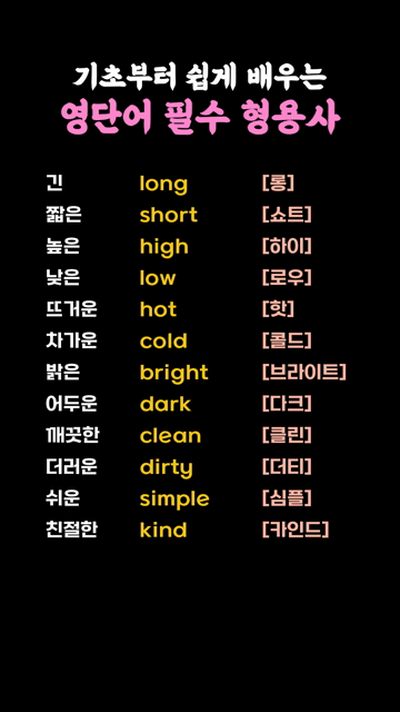 이 카테고리 글 더보기 상태를 나타내는 간단한 형용사 모음 색깔과 기본 성질을 나타내는 형용사 모음 음식의 맛과 상태를 표현하는 형용사 모음 감정을 나타내는 쉬운 형용사 모양과 상태를 나타내는 쉬운 형용사 일상에서 많이 쓰는 초간단 형용사 기초회화에 꼭 필요한 쉬운 영단어 동사 영어실력 향상을 위한 형용사 모음 이번주 Top 5 해외에서 이동할 때 쓰는 여행영어 기초단어 여행영어단어 관리자 - 2026-03-25 과목 영어단어 모음 주제별 영단어 관리자 - 2026-03-25 매일 연습하는 초간단 기초 영단어 동사 동사/형용사 관리자 - 2026-03-26 ~ling으로 끝나는 영어단어 접두사/접미사 관리자 - 2026-03-25 비상상황에서 필요한 여행영어 단어 모음 여행영어단어 관리자 - 2026-03-25 기초부터 쉽게 배우는 영단어 필수 형용사 동사/형용사 기초부터 쉽게 배우는 영단어 필수 형용사 긴 long [롱]짧은 short [쇼트]높은 high [하이]낮은 low [로우]뜨거운 hot [핫]차가운 cold [콜드]밝은 bright [브라이트]어두운 dark [다크]깨끗한 clean [클린]더러운 dirty [더티]쉬운 simple [심플]친절한 kind [카인드]