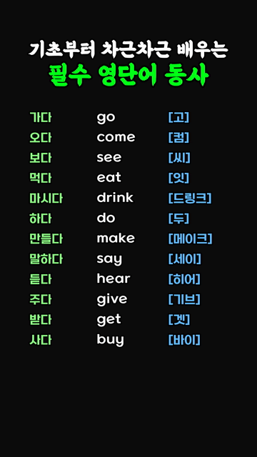 이 카테고리 글 더보기 왕초보도 쉽게 외우는 기초 영단어 동사 기초부터 탄탄히 다지는 필수 영단어 동사 왕초보가 꼭 알아야 할 기초 영단어 동사 처음부터 다시 배우는 기초 필수 영단어 동사 기본부터 다지는 필수 영단어 동사 하루에 하나씩 배우는 기초 동사 모음 기초 회화에 꼭 필요한 쉬운 동사 모음 차근차근 익히는 기초 영단어 동사 이번주 Top 5 장소 영어단어 모음 주제별 영단어 관리자 - 2026-03-25 해외여행 숙소 예약 관련 영단어 여행영어단어 관리자 - 2026-03-25 I’m here to ~ 패턴영어 패턴영어 관리자 - 2026-03-25 잡화 관련 영어단어 모아보기 생활영어단어 관리자 - 2026-03-25 ~ling으로 끝나는 영어단어 접두사/접미사 관리자 - 2026-03-25 기초부터 차근차근 배우는 필수 영단어 동사 동사/형용사 기초부터 차근차근 배우는 필수 영단어 동사 가다 go [고]오다 come [컴]보다 see [씨]먹다 eat [잇]마시다 drink [드링크]하다 do [두]만들다 make [메이크]말하다 say [세이]듣다 hear [히어]주다 give [기브]받다 get [겟]사다 buy [바이]