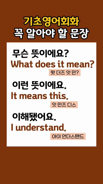 이 카테고리 글 더보기 기초 영어공부 꼭 필요한 문장 기초 영어 다시 시작! 3문장 배우기 하루 3문장 왕기초 영어 다시 시작하는 영어 아주 쉬운 문장 다시 배우는 영어 기초문장 배우기 초보영어회화 필수문장 배우기 다시 배우는 영어 초간단 회화 하루 3문장 초간단 영어회화 영어 왕초보 매일 표현 배우기 처음부터 다시 시작하는 영어 이번주 Top 5 해외에서 길 물어볼 때 쓰는 단어 여행영어단어 관리자 - 2026-03-25 원어민 억양에 가까워지는 생활영어 10문장 생활영어문장 관리자 - 2026-03-26 기초부터 쉽게 배우는 왕초보 필수 영단어 동사 동사/형용사 관리자 - 2026-03-25 아주 쉬운 영어 형용사 모음 왕초보단어 관리자 - 2026-03-25 초보 탈출을 위한 쉬운 동사 왕초보단어 관리자 - 2026-03-26 기초영어회화 꼭 알아야 할 문장 왕초보문장 기초영어회화 꼭 알아야 할 문장 무슨 뜻이에요?What does it mean?[왓 더즈 잇 민?] 이런 뜻이에요.It means this.[잇 민즈 디스] 이해됐어요.I understand.[아이 언더스탠드]