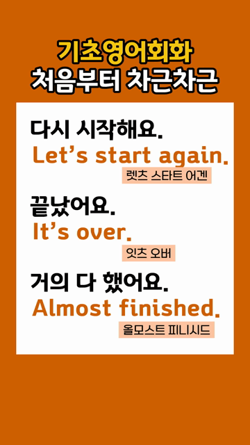 이 카테고리 글 더보기 기초영어회화 꼭 쓰는 표현 기초영어회화 한걸음 더! 하루 3문장 왕기초 영어 다시 시작하는 영어 아주 쉬운 문장 왕초보를 위한 필수 생활영어 영어 처음부터 다시 공부하기 하루 3문장 초간단 영어회화 다시 배우는 기초 영어회화 표현 이번주 Top 5 왕초보도 쉽게 배우는 필수 영어단어 왕초보단어 관리자 - 2026-03-25 up~ 로 시작하는 영어단어 접두사/접미사 관리자 - 2026-03-27 왕초보를 위한 필수 생활영어 왕초보문장 관리자 - 2026-03-26 매일 쓰는 쉬운 영어 동사 왕초보단어 관리자 - 2026-03-25 날씨 영어단어 모음 주제별 영단어 관리자 - 2026-03-25 기초영어회화 처음부터 차근차근 왕초보문장 기초영어회화 처음부터 차근차근 다시 시작해요.Let’s start again.[렛츠 스타트 어게인] 끝났어요.It’s over.[잇츠 오버] 거의 다 했어요.Almost finished.