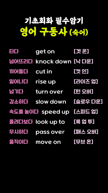 이 카테고리 글 더보기 쉽게 익히는 생활영어 구동사 (숙어) 매일 쓰기 좋은 영어 구동사 (숙어) 기초회화에 유용하게 쓰는 영어 구동사 (숙어) 영어초보 필수암기 기초 영어 구동사 (숙어) 부담없이 배우는 쉬운 영어 구동사 (숙어) 하루에 하나씩 외우는 기초 구동사 (숙어) 영어초보도 바로 쓰는 쉬운 구동사 (숙어) 꼭 익혀두면 좋은 기초 영어 구동사 (숙어) 이번주 Top 5 왕초보도 쉽게 배우는 필수 영어단어 왕초보단어 관리자 - 2026-03-25 다시 영어 시작할 때 배워야 할 기초문장 왕초보문장 관리자 - 2026-03-25 미국인이 매일 말하는 영어표현 10가지 생활영어문장 관리자 - 2026-03-25 가장 기본이 되는 쉬운 형용사 왕초보단어 관리자 - 2026-03-25 해외여행 준비할 때 알아두는 여행영어 기본단어 여행영어단어 관리자 - 2026-03-25 기초회화 필수암기 영어 구동사 (숙어) 구동사(숙어) 기초회화 필수암기 영어 구동사 (숙어) 타다 get on [겟 온]넘어뜨리다 knock down [낙 다운]끼어들다 cut in [컷 인]일어나다 rise up [라이즈 업]넘기다 turn over [턴 오버]감소하다 slow down [슬로우 다운]속도를 높이다 speed up [스피드 업]올려다보다 look up to [룩 업 투]무시하다 pass over [패스 오버]움직이다 move on [무브 온]