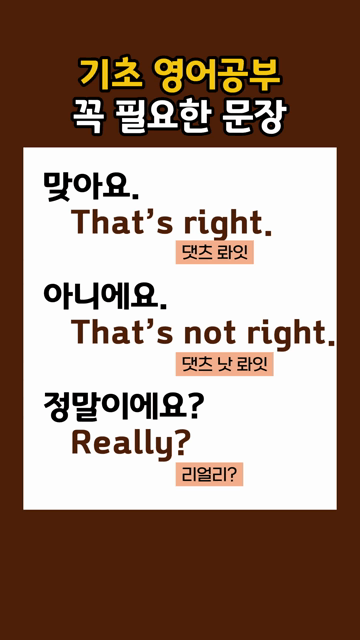 이 카테고리 글 더보기 다시 시작하는 영어 초간단 영어문장 왕초보가 바로 쓰는 참쉬운 생활영어 다시 시작하는 아주 쉬운 영어회화 하루 3문장 실생활 영어 배우기 왕초보 영어 한걸음부터 시작하기 처음부터 다시 시작하는 영어 하루 3문장 왕기초 영어 문장 다시 배우는 영어 기초문장 모음 이번주 Top 5 꼭 알아두면 좋은 영어 필수 구동사 (숙어) 구동사(숙어) 관리자 - 2026-03-25 축하 영어단어 모음 주제별 영단어 관리자 - 2026-03-25 다시 영어 시작하는 기초영어 필수단어 왕초보단어 관리자 - 2026-03-25 초보도 쉽게 배우는 필수 구동사 (숙어) 구동사(숙어) 관리자 - 2026-03-25 약속 영어단어 모음 주제별 영단어 관리자 - 2026-03-25 기초 영어공부 꼭 필요한 문장 왕초보문장 기초 영어공부 꼭 필요한 문장 맞아요.That’s right.[댓츠 라잇] 아니에요.That’s not right.[댓츠 낫 라잇] 정말이에요?Really?[리얼리?]