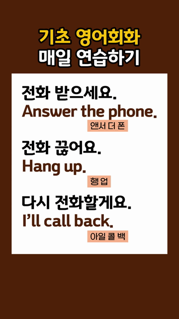 이 카테고리 글 더보기 기초영어회화 처음 배우는 영어 기초영어회화 하루 3문장 왕초보가 먼저 외워야 할 영어문장 다시 시작하는 아주 쉬운 영어 다시 시작하는 영어 초간단 영어문장 하루 3문장 쉬운 영어 영어 왕초보 오늘의 회화 기초 영어회화 처음 배우는 문장 하루 3문장 아주 쉬운 영어 왕초보 영어 기본문장 배우기 이번주 Top 5 외국인 앞에서 자연스럽게 말할 수 있는 문장 10개 생활영어문장 관리자 - 2026-03-26 circum~으로 시작하는 영어단어 접두사/접미사 관리자 - 2026-03-27 기초 회화에 꼭 필요한 쉬운 동사 모음 동사/형용사 관리자 - 2026-03-25 뉴스 영어단어 모음 주제별 영단어 관리자 - 2026-03-28 ~ity 로 끝나는 영어단어 접두사/접미사 관리자 - 2026-03-27 기초 영어회화 매일 연습하기 왕초보문장 기초 영어회화 매일 연습하기 전화 받으세요.Answer the phone.[앤서 더 폰] 전화 끊어요.Hang up.[행 업] 다시 전화할게요.I’ll call back.[아일 콜 백]