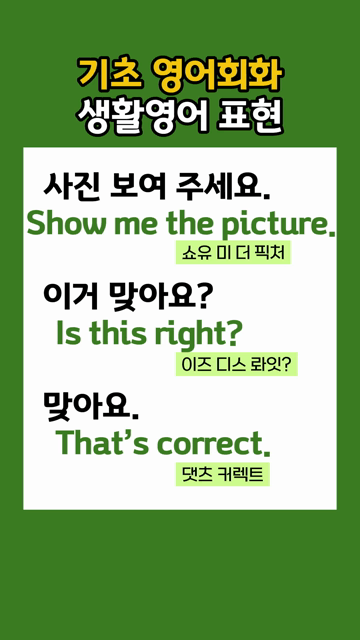 이 카테고리 글 더보기 영어 왕초보 필수암기 문장 다시 배우는 초급영어회화 기초 영어회화 하루 3문장 영어 왕초보 오늘의 문장 다시 시작하는 생활영어 왕초보가 먼저 외워야 할 영어문장 기초부터 다시 배우는 아주 쉬운 영어문장 영어 왕초보 한걸음 한걸음 하루 3문장 기초 영어 회화 왕초보 필수 일상영어 회화 이번주 Top 5 다시 정리하는 영어 중학교 수준 영단어 초등/중등 영단어 관리자 - 2026-03-26 하루 3문장 실생활 영어 배우기 왕초보문장 관리자 - 2026-03-25 왕초보 영어회화 매일 연습하기 왕초보문장 관리자 - 2026-03-28 이사 영어단어 모음 주제별 영단어 관리자 - 2026-03-25 I’ve known ~ 패턴영어 패턴영어 관리자 - 2026-03-25 기초 영어회화 생활영어 표현 왕초보문장 기초 영어회화 생활영어 표현 사진 보여 주세요.Show me the picture.[쇼우 미 더 픽처] 이거 맞아요?Is this right?[이즈 디스 라잇?] 맞아요.That’s correct.[댓츠 커렉트]