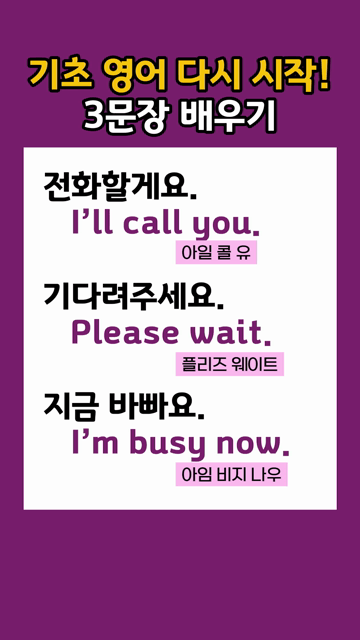 이 카테고리 글 더보기 다시 시작하는 영어 초간단 영어문장 왕초보가 바로 쓰는 참쉬운 생활영어 다시 시작하는 아주 쉬운 영어회화 하루 3문장 실생활 영어 배우기 왕초보 영어 한걸음부터 시작하기 기초 영어공부 꼭 필요한 문장 처음부터 다시 시작하는 영어 하루 3문장 왕기초 영어 문장 이번주 Top 5 날씨 영어단어 모음 주제별 영단어 관리자 - 2026-03-25 기초회화 필수암기 영어 구동사 (숙어) 구동사(숙어) 관리자 - 2026-03-25 잡화 관련 영어단어 모아보기 생활영어단어 관리자 - 2026-03-25 How far is ~? 패턴영어 패턴영어 관리자 - 2026-03-25 ~ence로 끝나는 영어단어 접두사/접미사 관리자 - 2026-03-25 기초 영어 다시 시작! 3문장 배우기 왕초보문장 기초 영어 다시 시작! 3문장 배우기 전화할게요.I’ll call you.[아일 콜 유] 기다려주세요.Please wait.[플리즈 웨이트] 지금 바빠요.I’m busy now.[아임 비지 나우]