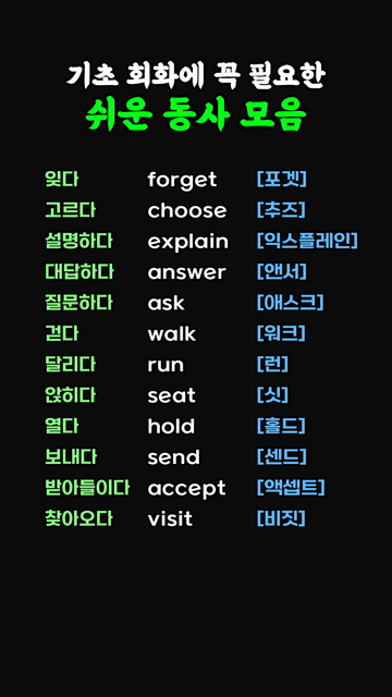 이 카테고리 글 더보기 상태를 나타내는 간단한 형용사 모음 색깔과 기본 성질을 나타내는 형용사 모음 음식의 맛과 상태를 표현하는 형용사 모음 감정을 나타내는 쉬운 형용사 모양과 상태를 나타내는 쉬운 형용사 일상에서 많이 쓰는 초간단 형용사 기초회화에 꼭 필요한 쉬운 영단어 동사 영어실력 향상을 위한 형용사 모음 이번주 Top 5 Whatever ~ 패턴영어 패턴영어 관리자 - 2026-03-26 It’s possible ~ 패턴영어 패턴영어 관리자 - 2026-03-25 영어초보가 먼저 외울 단어 왕초보단어 관리자 - 2026-03-26 Any ~ ? 패턴영어 패턴영어 관리자 - 2026-03-26 처음 영어 시작하는 분들을 위한 쉬운 형용사 동사/형용사 관리자 - 2026-03-27 기초 회화에 꼭 필요한 쉬운 동사 모음 동사/형용사 기초 회화에 꼭 필요한 쉬운 동사 모음 잊다 forget [포겟]고르다 choose [추즈]설명하다 explain [익스플레인]대답하다 answer [앤서]질문하다 ask [애스크]걷다 walk [워크]달리다 run [런]앉히다 seat [싯]열다 hold [홀드]보내다 send [센드]받아들이다 accept [액셉트]찾아오다 visit [비짓]