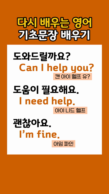 이 카테고리 글 더보기 하루 3문장 왕기초 영어 기초 영어회화 처음 배우는 문장 하루 3문장 생활영어회화 영어 처음 배울 때 꼭 배워야하는 문장 영어 왕초보가 매일 연습해야 하는 문장 다시 시작하는 기초 영어회화 하루에 3문장 왕초보 영어회화 하루 3문장 실생활 영어 배우기 왕초보 영어회화 매일 연습하기 하루3문장 아주 쉬운 표현 이번주 Top 5 기초부터 다시 시작하는 초등 필수 영단어 초등/중등 영단어 관리자 - 2026-03-28 경제 영어단어 모음 생활영어단어 관리자 - 2026-03-26 걱정 영어단어 모음 주제별 영단어 관리자 - 2026-03-28 ~ment 로 끝나는 영어단어 접두사/접미사 관리자 - 2026-03-27 아무 때나 쓰기 좋은 필수 캐주얼 영어 10개 생활영어문장 관리자 - 2026-03-28 다시 배우는 영어 기초문장 배우기 왕초보문장 다시 배우는 영어 기초문장 배우기 도와드릴까요?Can I help you?[캔 아이 헬프 유] 도움이 필요해요.I need help.[아이 니드 헬프] 괜찮아요.I’m fine.[아임 파인]