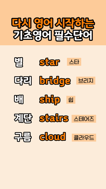 이 카테고리 글 더보기 아주 쉬운 영어 형용사 모음 바로 말할 수 있는 쉬운 영어단어 매일 쓰는 쉬운 영어단어 하루에 꼭 쓰는 기초 영어단어 매일 쓰는 쉬운 영어 동사 상태를 나타내는 참쉬운 형용사 영어초보 필수암기 생활 영어단어 초급자가 꼭 알아야 할 기초 생활영어 단어 이번주 Top 5 부담없이 외우는 쉬운 영어 구동사 (숙어) 구동사(숙어) 관리자 - 2026-03-25 기초 영어 다시 시작! 3문장 배우기 왕초보문장 관리자 - 2026-03-25 해외 관광지에서 자주 사용하는 영단어 여행영어단어 관리자 - 2026-03-25 왕초보가 꼭 알아야 할 기초 영단어 동사 동사/형용사 관리자 - 2026-03-25 부담없이 배우는 쉬운 영어 구동사 (숙어) 구동사(숙어) 관리자 - 2026-03-25 다시 영어 시작하는 기초영어 필수단어 왕초보단어 다시 영어 시작하는 기초영어 필수단어 별 star [스타]다리 bridge [브리지]배 ship [쉽]계단 stairs [스테어즈]구름 cloud [클라우드]