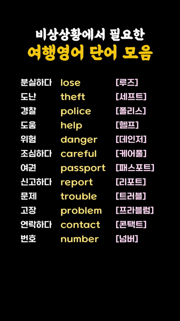이 카테고리 글 더보기 해외로 여행 갔을 때 기본 대화에 필요한 단어 기초영어 여행영어 날씨 관련 단어 모음 해외여행가서 쇼핑할 때 알아두면 좋은 단어 해외여행 영어단어 음식 주문 관련 단어 해외여행 가서 사용하는 교통수단 이용 영단어 해외여행 숙소 예약 관련 영단어 해외여행 비행기 안에서 쓰는 여행영어 단어 모음 해외 관광지에서 자주 사용하는 영단어 이번주 Top 5 진짜 미국식 영어로 말하고 싶을 때 쓰는 표현 10개 생활영어문장 관리자 - 2026-03-25 기초 영어 다시 시작! 3문장 배우기 왕초보문장 관리자 - 2026-03-25 미국인이 매일 쓰는 생활 영어표현 10가지 생활영어문장 관리자 - 2026-03-25 다시 정리하는 중학교 실력 향상 영단어 초등/중등 영단어 관리자 - 2026-03-25 ~ic으로 끝나는 영어단어 접두사/접미사 관리자 - 2026-03-25 비상상황에서 필요한 여행영어 단어 모음 여행영어단어 비상상황에서 필요한 여행영어 단어 모음 분실하다 lose [루즈]도난 theft [씨프트]경찰 police [폴리스]도움 help [헬프]위험 danger [데인저]조심하다 careful [케어풀]여권 passport [패스포트]신고하다 report [리포트]문제 trouble [트러블]고장 problem [프라블럼]연락하다 contact [콘택트]번호 number [넘버]