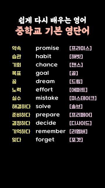 이 카테고리 글 더보기 다시 시작하는 영어 중학교 핵심 영단어 다시 시작하는 영어 중학 수준 필수 영단어 다시 처음부터 시작하는 영어 중학교 핵심 필수 영단어 중학교 수준 필수 확장 영단어 모음 다시 정리하는 중학교 실력 향상 영단어 중학교 수준이면 꼭 알아야 할 필수 영단어 다시 탄탄하게 다지는 영어 중학교 핵심 영단어 기초부터 다시 정리하는 영어 필수 중학교 영단어 이번주 Top 5 I like your ~ 패턴영어 패턴영어 관리자 - 2026-03-25 다시 시작하는 영어 중학교 핵심 영단어 초등/중등 영단어 관리자 - 2026-03-25 초급자가 꼭 알아야 할 기초 생활영어 단어 왕초보단어 관리자 - 2026-03-25 기초부터 차근차근 배우는 필수 영단어 동사 동사/형용사 관리자 - 2026-03-25 해외여행 숙소 예약 관련 영단어 여행영어단어 관리자 - 2026-03-25 쉽게 다시 배우는 영어 중학교 기본 영단어 초등/중등 영단어 쉽게 다시 배우는 영어 중학교 기본 영단어 약속 promise [프라미스]습관 habit [해빗]기회 chance [챈스]목표 goal [골]꿈 dream [드림]노력 effort [에퍼트]실수 mistake [미스테이크]해결하다 solve [솔브]준비하다 prepare [프리페어]결정하다 decide [디사이드]기억하다 remember [리멤버]잊다 forget [포겟]