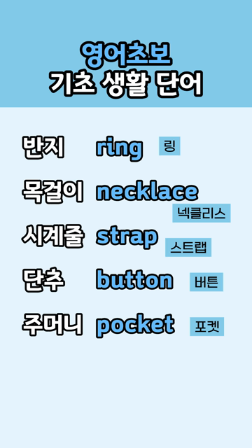 이 카테고리 글 더보기 초보를 위한 기초 생활 단어 바로 말할 수 있는 쉬운 영어단어 초보자가 알아야 할 기초영어 필수 동사 왕초보도 알 수 있는 기초 영어 단어 왕초보가 바로 외우는 쉬운 영어단어 초보 탈출을 위한 쉬운 영어동사 생활에서 많이 쓰는 기초적인 영어동사 지금 당장 써먹기 쉬운 초보 영어단어 왕초보도 쉽게 배우는 기초 영어단어 왕초보가 외우기 좋은 기초 단어 이번주 Top 5 영어초보도 바로 쓰는 쉬운 구동사 (숙어) 구동사(숙어) 관리자 - 2026-03-25 mal~ 로 시작하는 영어단어 접두사/접미사 관리자 - 2026-03-26 왕초보도 바로 읽는 쉬운 영어단어 왕초보단어 관리자 - 2026-03-26 미국 친구들이 편하게 쓰는 캐주얼 영어 10문장 생활영어문장 관리자 - 2026-03-28 하루 3문장 초간단 영어회화 왕초보문장 관리자 - 2026-03-26 영어초보 기초 생활 단어 왕초보단어 영어초보 기초 생활 단어 반지 ring [링]목걸이 necklace [네클리스]시계줄 strap [스트랩]단추 button [버튼]주머니 pocket [포켓]