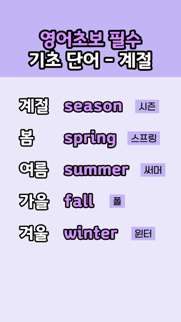 이 카테고리 글 더보기 영어초보 기초 생활 단어 초보탈출을 위한 필수암기 영어단어 초보가 외우기 쉬운 기초 단어 지금 당장 써먹기 쉬운 초보 영어단어 왕초보가 바로 외우는 쉬운 영어단어 왕초보도 읽을 수 있는 쉬운 영어단어 다시 영어 도전할 때 먼저 배우는 형용사 매일 쓰는 쉬운 영어 동사 매일 쓰는 쉬운 영어단어 영어초보를 위한 핵심 동사 모음 이번주 Top 5 I love to ~ 패턴영어 패턴영어 관리자 - 2026-03-26 ~ness로 끝나는 영어단어 접두사/접미사 관리자 - 2026-03-27 ~age 로 끝나는 영어단어 접두사/접미사 관리자 - 2026-03-27 이비인후과 영어단어 모음 주제별 영단어 관리자 - 2026-03-28 원어민이 입에 달고 사는 필수영어 10문장 생활영어문장 관리자 - 2026-03-26 영어초보 필수 기초 단어 – 계절 왕초보단어 영어초보 필수 기초 단어 – 계절 계절 season [시즌]봄 spring [스프링]여름 summer [써머]가을 fall [폴]겨울 winter [윈터]
