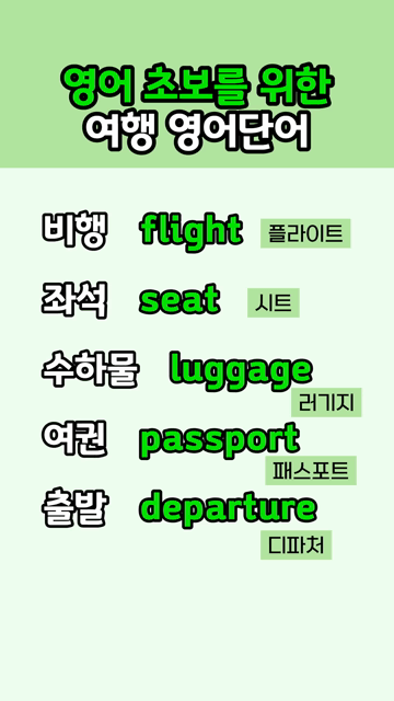 이 카테고리 글 더보기 기초부터 다시 배우는 쉬운 형용사 다시 시작하는 영어 쉬운 형용사 처음 영어 배우는 기초 필수 단어 왕초보도 읽을 수 있는 쉬운 영어단어 영어초보 기초 생활 단어 영어초보 필수 생활 영어단어 하루에 꼭 쓰는 기초 영어단어 초보를 위한 기초 생활 단어 다시 도전하는 영어 쉬운 형용사 왕초보 필수암기 생활 영어단어 이번주 Top 5 기초영어 여행영어 날씨 관련 단어 모음 여행영어단어 관리자 - 2026-03-25 결혼 영어단어 모음 주제별 영단어 관리자 - 2026-03-26 기초영어회화 꼭 알아야 할 문장 왕초보문장 관리자 - 2026-03-29 네이티브들이 말끝에 자주 붙이는 표현 10문장 생활영어문장 관리자 - 2026-03-26 왕초보도 이해하는 쉬운 영어 구동사 (숙어) 구동사(숙어) 관리자 - 2026-03-25 영어 초보를 위한 여행 영어단어 왕초보단어 영어 초보를 위한 여행 영어단어 비행 flight [플라이트]좌석 seat [시트]수하물 luggage [러기지]여권 passport [패스포트]출발 departure [디파처]
