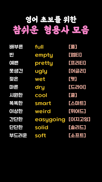 이 카테고리 글 더보기 상태를 나타내는 간단한 형용사 모음 색깔과 기본 성질을 나타내는 형용사 모음 음식의 맛과 상태를 표현하는 형용사 모음 감정을 나타내는 쉬운 형용사 모양과 상태를 나타내는 쉬운 형용사 일상에서 많이 쓰는 초간단 형용사 기초회화에 꼭 필요한 쉬운 영단어 동사 영어실력 향상을 위한 형용사 모음 이번주 Top 5 영어초보를 위한 핵심 동사 모음 왕초보단어 관리자 - 2026-03-26 처음 영어 배우는 기초 필수 단어 왕초보단어 관리자 - 2026-03-26 영어 초보도 쉽게 따라할 수 있는 표현 10개 생활영어문장 관리자 - 2026-03-25 ~ence로 끝나는 영어단어 접두사/접미사 관리자 - 2026-03-25 전화할 때 원어민처럼 말하는 영어문장 10개 생활영어문장 관리자 - 2026-03-25 영어 초보를 위한 참쉬운 형용사 모음 동사/형용사 영어 초보를 위한 참쉬운 형용사 모음 배부른 full [풀]빈 empty [엠티]예쁜 pretty [프리티]못생긴 ugly [어글리]젖은 wet [웻]마른 dry [드라이]시원한 cool [쿨]똑똑한 smart [스마트]이상한 weird [위어드]간단한 easygoing [이지고잉]단단한 solid [솔리드]부드러운 soft [소프트]