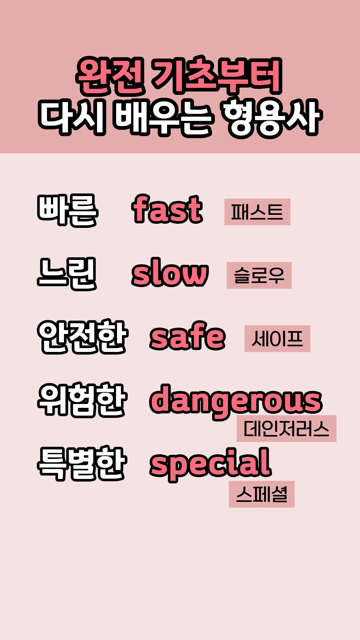 이 카테고리 글 더보기 다시 영어 시작하는 쉬운 형용사 영어초보 기초 생활영어 단어 초보가 외우기 쉬운 기초 단어 영어초보 필수 생활 영어단어 초보를 위한 기초 생활 단어 초보를 위한 핵심 동사 모음 처음 영어할 때 배우는 필수 단어 영어초보 필수 생활 영어단어 왕초보가 외우기 좋은 기초 단어 초보 탈출을 위한 쉬운 영어동사 이번주 Top 5 왕초보도 바로 읽는 쉬운 영어단어 왕초보단어 관리자 - 2026-03-26 양보 영어단어 모음 주제별 영단어 관리자 - 2026-03-26 원어민처럼 말할 수 있는 실전 영어문장 10개 생활영어문장 관리자 - 2026-03-25 왕초보도 바로 이해하는 기본 형용사 동사/형용사 관리자 - 2026-03-27 미국인이 자연스럽게 툭 던지는 필수 문장 10개 생활영어문장 관리자 - 2026-03-26 완전 기초부터 다시 배우는 형용사 왕초보단어 완전 기초부터 다시 배우는 형용사 빠른 fast [패스트]느린 slow [슬로우]안전한 safe [세이프]위험한 dangerous [데인저러스]특별한 special [스페셜]
