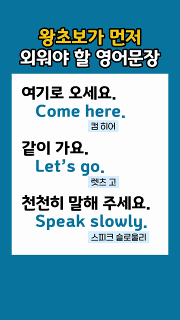 이 카테고리 글 더보기 다시 시작하는 영어 초간단 영어문장 왕초보가 바로 쓰는 참쉬운 생활영어 다시 시작하는 아주 쉬운 영어회화 하루 3문장 실생활 영어 배우기 왕초보 영어 한걸음부터 시작하기 기초 영어공부 꼭 필요한 문장 처음부터 다시 시작하는 영어 하루 3문장 왕기초 영어 문장 이번주 Top 5 평소 말처럼 자연스러운 영어표현 10개 생활영어문장 관리자 - 2026-03-25 충고/조언 영어단어 모음 생활영어단어 관리자 - 2026-03-25 일상대화에서 정말 많이 사용하는 영어문장 10개 생활영어문장 관리자 - 2026-03-25 I’ve known ~ 패턴영어 패턴영어 관리자 - 2026-03-25 원어민처럼 말할 수 있는 실전 영어문장 10개 생활영어문장 관리자 - 2026-03-25 왕초보가 먼저 외워야 할 영어문장 왕초보문장 왕초보가 먼저 외워야 할 영어문장 여기로 오세요.Come here.[컴 히어] 같이 가요.Let’s go.[렛츠 고] 천천히 말해 주세요.Speak slowly.[스피크 슬로울리]