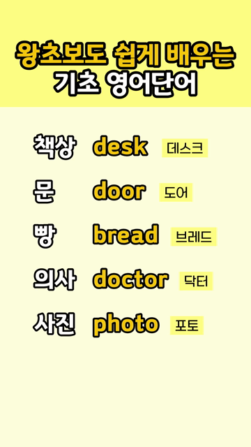 이 카테고리 글 더보기 쉬운 형용사부터 다시 시작하는 영어 영어초보 필수 생활 영어단어 초보가 먼저 배우는 영어 기본 동사 왕초보도 읽을 수 있는 쉬운 영어단어 다시 영어 도전할 때 먼저 배우는 형용사 초보를 위한 기초 생활 단어 초보를 위한 핵심 동사 모음 처음 영어 배우는 기초 필수 단어 이번주 Top 5 가구 영어단어 한꺼번에 모아보기 생활영어단어 관리자 - 2026-03-26 ~sion 으로 끝나는 영어단어 접두사/접미사 관리자 - 2026-03-26 자연 영어단어 모음 주제별 영단어 관리자 - 2026-03-25 다시 시작하는 생활영어 왕초보문장 관리자 - 2026-03-26 교과서에 없는 실생활 영어문장 10개 생활영어문장 관리자 - 2026-03-26 왕초보도 쉽게 배우는 기초 영어단어 왕초보단어 왕초보도 쉽게 배우는 기초 영어단어 책상 desk [데스크]문 door [도어]빵 bread [브레드]의사 doctor [닥터]사진 photo [포토]