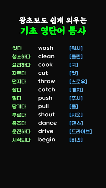 이 카테고리 글 더보기 기초부터 탄탄히 다지는 필수 영단어 동사 왕초보가 꼭 알아야 할 기초 영단어 동사 처음부터 다시 배우는 기초 필수 영단어 동사 기본부터 다지는 필수 영단어 동사 하루에 하나씩 배우는 기초 동사 모음 기초 회화에 꼭 필요한 쉬운 동사 모음 차근차근 익히는 기초 영단어 동사 기초부터 쉽게 배우는 왕초보 필수 영단어 동사 이번주 Top 5 It seems like ~ 패턴영어 패턴영어 관리자 - 2026-03-25 원어민이 진짜 자주 쓰는 영어표현 10가지 생활영어문장 관리자 - 2026-03-25 약속 영어단어 한눈에 보기 생활영어단어 관리자 - 2026-03-25 기초부터 다시 배우는 아주 쉬운 영어문장 왕초보문장 관리자 - 2026-03-25 신체 영어단어 모음 주제별 영단어 관리자 - 2026-03-25 왕초보도 쉽게 외우는 기초 영단어 동사 동사/형용사 왕초보도 쉽게 외우는 기초 영단어 동사 씻다 wash [워시]청소하다 clean [클린]요리하다 cook [쿡]자르다 cut [컷]던지다 throw [스로우]잡다 catch [캐치]밀다 push [푸시]당기다 pull [풀]부르다 shout [샤웃]춤추다 dance [댄스]운전하다 drive [드라이브]시작되다 begin [비긴]