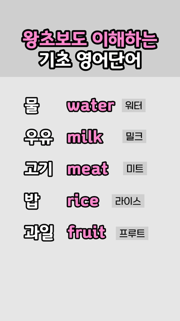이 카테고리 글 더보기 쉬운 형용사부터 다시 시작하는 영어 영어초보 필수 생활 영어단어 초보가 먼저 배우는 영어 기본 동사 왕초보도 읽을 수 있는 쉬운 영어단어 다시 영어 도전할 때 먼저 배우는 형용사 초보를 위한 기초 생활 단어 초보를 위한 핵심 동사 모음 처음 영어 배우는 기초 필수 단어 이번주 Top 5 지금 당장 써먹기 쉬운 초보 영어단어 왕초보단어 관리자 - 2026-03-25 병원 영어단어 모음 주제별 영단어 관리자 - 2026-03-26 쉬운 형용사부터 다시 시작하는 영어 왕초보단어 관리자 - 2026-03-26 원어민이 쓰는 진짜 영어! 교과서엔 없는 표현 10개 생활영어문장 관리자 - 2026-03-26 해외여행 준비할 때 알아두는 여행영어 기본단어 여행영어단어 관리자 - 2026-03-25 왕초보도 이해하는 기초 영어단어 왕초보단어 왕초보도 이해하는 기초 영어단어 물 water [워터]우유 milk [밀크]고기 meat [미트]밥 rice [라이스]과일 fruit [프루트]