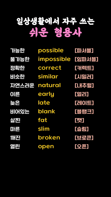 이 카테고리 글 더보기 상태를 나타내는 간단한 형용사 모음 색깔과 기본 성질을 나타내는 형용사 모음 음식의 맛과 상태를 표현하는 형용사 모음 감정을 나타내는 쉬운 형용사 모양과 상태를 나타내는 쉬운 형용사 일상에서 많이 쓰는 초간단 형용사 기초회화에 꼭 필요한 쉬운 영단어 동사 영어실력 향상을 위한 형용사 모음 이번주 Top 5 다시 영어 도전하는 쉬운 형용사 왕초보단어 관리자 - 2026-03-26 I’m here to ~ 패턴영어 패턴영어 관리자 - 2026-03-25 하루 3문장 아주 쉬운 영어 왕초보문장 관리자 - 2026-03-26 가구 영어단어 모음 주제별 영단어 관리자 - 2026-03-25 칭찬 영어단어 모음 주제별 영단어 관리자 - 2026-03-25 일상생활에서 자주 쓰는 쉬운 형용사 동사/형용사 일상생활에서 자주 쓰는 쉬운 형용사 가능한 possible [파서블]불가능한 impossible [임파서블]정확한 correct [커렉트]비슷한 similar [시밀러]자연스러운 natural [내추럴]이른 early [얼리]늦은 late [레이트]비어있는 blank [블랭크]살찐 fat [팻]마른 slim [슬림]깨진 broken [브로큰]열린 open [오픈]