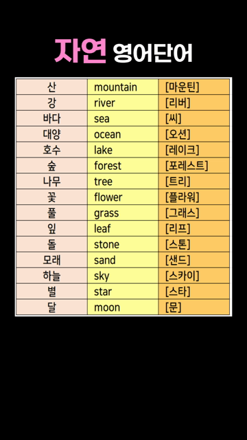 이 카테고리 글 더보기 동물 영어단어 모음 운전 영어단어 모음 관광 영어단어 모음 주유소 영어단어 모음 욕실/화장실 영어단어 모음 재난 영어단어 모음 전화 영어단어 모음 지하철 영어단어 모음 이번주 Top 5 기초 영어 다시 시작! 3문장 배우기 왕초보문장 관리자 - 2026-03-25 잡화 관련 영어단어 모아보기 생활영어단어 관리자 - 2026-03-25 re~ 로 시작하는 영어단어 접두사/접미사 관리자 - 2026-03-27 I should ~ 패턴영어 패턴영어 관리자 - 2026-03-25 하루에 하나씩 배우는 기초 동사 모음 동사/형용사 관리자 - 2026-03-25 자연 영어단어 모음 주제별 영단어 자연 영어단어 모음 산 mountain [마운틴]강 river [리버]바다 sea [씨]대양 ocean [오션]호수 lake [레이크]숲 forest [포레스트]나무 tree [트리]꽃 flower [플라워]풀 grass [그래스]잎 leaf [리프]돌 stone [스톤]모래 sand [샌드]하늘 sky [스카이]별 star [스타]달 moon [문]