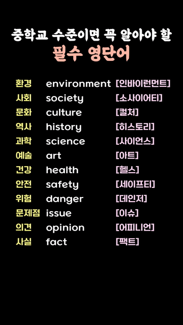 이 카테고리 글 더보기 다시 시작하는 영어 중학교 핵심 영단어 다시 시작하는 영어 중학 수준 필수 영단어 다시 처음부터 시작하는 영어 중학교 핵심 필수 영단어 중학교 수준 필수 확장 영단어 모음 다시 정리하는 중학교 실력 향상 영단어 쉽게 다시 배우는 영어 중학교 기본 영단어 다시 탄탄하게 다지는 영어 중학교 핵심 영단어 기초부터 다시 정리하는 영어 필수 중학교 영단어 이번주 Top 5 충고/조언 영어단어 모음 생활영어단어 관리자 - 2026-03-25 다시 시작하는 아주 쉬운 영어회화 왕초보문장 관리자 - 2026-03-25 바로 말할 수 있는 쉬운 영어단어 왕초보단어 관리자 - 2026-03-25 I’m here to ~ 패턴영어 패턴영어 관리자 - 2026-03-25 가격 흥정 영어단어 모음 생활영어단어 관리자 - 2026-03-25 중학교 수준이면 꼭 알아야 할 필수 영단어 초등/중등 영단어 중학교 수준이면 꼭 알아야 할 필수 영단어 환경 environment [인바이런먼트]사회 society [소사이어티]문화 culture [컬처]역사 history [히스토리]과학 science [사이언스]예술 art [아트]건강 health [헬스]안전 safety [세이프티]위험 danger [데인저]문제점 issue [이슈]의견 opinion [어피니언]사실 fact [팩트]