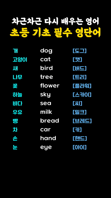 이 카테고리 글 더보기 차분히 배우는 초등 감정 표현 단어 초등 필수 음식 관련 영어단어 순서와 방향 익히기 초등 영단어 기초 형용사 다시 정리하기 기본을 익히는 초등 필수 동사 차근차근 배우는 초등 기본 단어 생활 속에서 자주 쓰는 초등 기초 영단어 기초를 단단히 하는 초등 필수 영단어 이번주 Top 5 해외에서 이동할 때 쓰는 여행영어 기초단어 여행영어단어 관리자 - 2026-03-25 왕초보도 쉽게 배우는 필수 영어단어 왕초보단어 관리자 - 2026-03-25 카페나 식당에서 자주 듣는 영어표현 10개 생활영어문장 관리자 - 2026-03-26 초등 필수 음식 관련 영어단어 초등/중등 영단어 관리자 - 2026-03-28 Whatever ~ 패턴영어 패턴영어 관리자 - 2026-03-26 차근차근 다시 배우는 영어 초등 기초 필수 영단어 초등/중등 영단어 차근차근 다시 배우는 영어 초등 기초 필수 영단어 개 dog [도그]고양이 cat [캣]새 bird [버드]나무 tree [트리]꽃 flower [플라워]하늘 sky [스카이]바다 sea [씨]우유 milk [밀크]빵 bread [브레드]차 car [카]손 hand [핸드]눈 eye [아이]