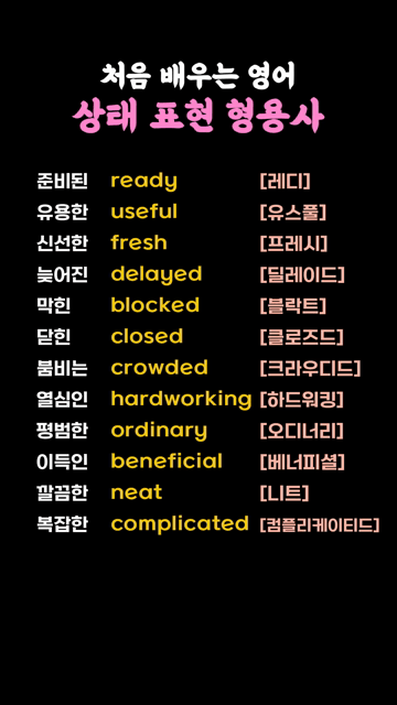 이 카테고리 글 더보기 상태를 나타내는 간단한 형용사 모음 색깔과 기본 성질을 나타내는 형용사 모음 음식의 맛과 상태를 표현하는 형용사 모음 감정을 나타내는 쉬운 형용사 모양과 상태를 나타내는 쉬운 형용사 일상에서 많이 쓰는 초간단 형용사 기초회화에 꼭 필요한 쉬운 영단어 동사 영어실력 향상을 위한 형용사 모음 이번주 Top 5 다시 시작하는 영어 중학교 필수 영단어 초등/중등 영단어 관리자 - 2026-03-26 장소 영어단어 모음 주제별 영단어 관리자 - 2026-03-25 해외여행 가서 사용하는 교통수단 이용 영단어 여행영어단어 관리자 - 2026-03-25 원어민이 매일 아침 사용하는 영어표현 10개 생활영어문장 관리자 - 2026-03-25 해외여행 숙소에서 사용하는 여행영어 단어 여행영어단어 관리자 - 2026-03-25 처음 배우는 영어 상태 표현 형용사 동사/형용사 처음 배우는 영어 상태 표현 형용사 준비된 ready [레디]유용한 useful [유스풀]신선한 fresh [프레시]늦어진 delayed [딜레이드]막힌 blocked [블락트]닫힌 closed [클로즈드]붐비는 crowded [크라우디드]열심인 hardworking [하드워킹]평범한 ordinary [오디너리]이득인 beneficial [베너피셜]깔끔한 neat [니트]복잡한 complicated [컴플리케이티드]
