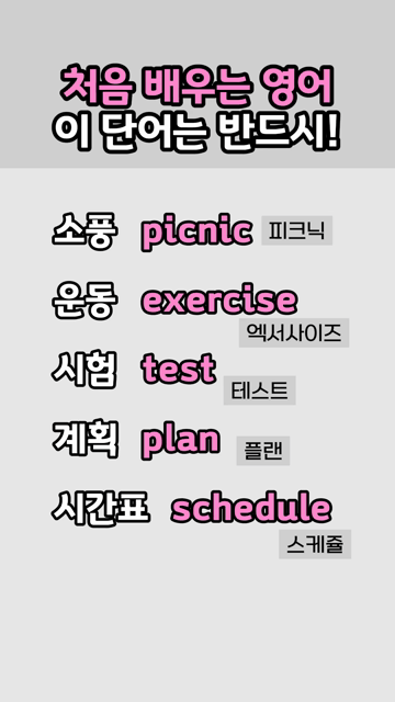 이 카테고리 글 더보기 일상에서 자주 쓰는 기초 형용사 초보를 위한 기초 생활 단어 왕초보도 쉽게 배우는 기초 영어단어 초보가 외우기 쉬운 기초 단어 초보가 먼저 배우는 영어 기본 동사 가장 기본이 되는 쉬운 형용사 왕초보가 바로 외우는 쉬운 영어단어 왕초보가 외우기 좋은 기초 단어 왕초보도 읽을 수 있는 쉬운 영어단어 왕초보도 쉽게 배우는 필수 영어단어 이번주 Top 5 도서관 영어단어 모음 생활영어단어 관리자 - 2026-03-26 부담없이 배우는 쉬운 영어 구동사 (숙어) 구동사(숙어) 관리자 - 2026-03-25 왕초보 영어 기본문장 배우기 왕초보문장 관리자 - 2026-03-29 미국 드라마에 자주 나오는 영어표현 10가지 생활영어문장 관리자 - 2026-03-26 약국 영어단어 모음 주제별 영단어 관리자 - 2026-03-28 처음 배우는 영어 이 단어는 반드시! 왕초보단어 처음 배우는 영어 이 단어는 반드시! 소풍 picnic [피크닉]운동 exercise [엑서사이즈]시험 test [테스트]계획 plan [플랜]시간표 schedule [스케줄]