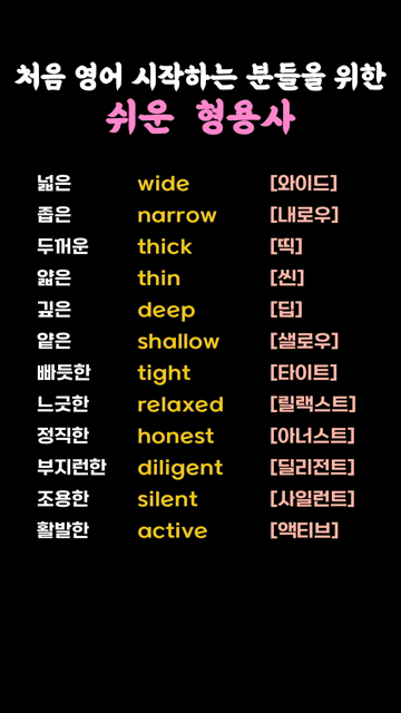 이 카테고리 글 더보기 상태를 나타내는 간단한 형용사 모음 색깔과 기본 성질을 나타내는 형용사 모음 음식의 맛과 상태를 표현하는 형용사 모음 감정을 나타내는 쉬운 형용사 모양과 상태를 나타내는 쉬운 형용사 일상에서 많이 쓰는 초간단 형용사 기초회화에 꼭 필요한 쉬운 영단어 동사 영어실력 향상을 위한 형용사 모음 이번주 Top 5 순서와 방향 익히기 초등 영단어 초등/중등 영단어 관리자 - 2026-03-28 초보가 먼저 배우는 영어 기본 동사 왕초보단어 관리자 - 2026-03-26 잡화 영어단어 모음 주제별 영단어 관리자 - 2026-03-25 신체 영어단어 모음 주제별 영단어 관리자 - 2026-03-25 ~eer 로 끝나는 영어단어 접두사/접미사 관리자 - 2026-03-26 처음 영어 시작하는 분들을 위한 쉬운 형용사 동사/형용사 처음 영어 시작하는 분들을 위한 쉬운 형용사 넓은 wide [와이드]좁은 narrow [내로우]두꺼운 thick [띡]얇은 thin [씬]깊은 deep [딥]얕은 shallow [샐로우]빠듯한 tight [타이트]느긋한 relaxed [릴랙스트]정직한 honest [아너스트]부지런한 diligent [딜리전트]조용한 silent [사일런트]활발한 active [액티브]