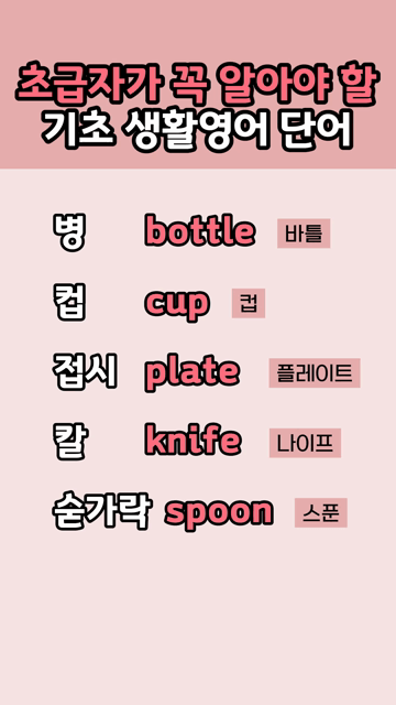 이 카테고리 글 더보기 쉬운 형용사부터 다시 시작하는 영어 영어초보 필수 생활 영어단어 초보가 먼저 배우는 영어 기본 동사 왕초보도 읽을 수 있는 쉬운 영어단어 다시 영어 도전할 때 먼저 배우는 형용사 초보를 위한 기초 생활 단어 초보를 위한 핵심 동사 모음 처음 영어 배우는 기초 필수 단어 이번주 Top 5 매일 연습하는 초간단 기초 영단어 동사 동사/형용사 관리자 - 2026-03-26 출퇴근 영어단어 모음 주제별 영단어 관리자 - 2026-03-26 기초부터 탄탄히 초등 완전기초 단어 초등/중등 영단어 관리자 - 2026-03-28 It seems like ~ 패턴영어 패턴영어 관리자 - 2026-03-25 물건찾기 영어단어 한꺼번에 모아보기 생활영어단어 관리자 - 2026-03-26 초급자가 꼭 알아야 할 기초 생활영어 단어 왕초보단어 초급자가 꼭 알아야 할 기초 생활영어 단어 병 bottle [바틀]컵 cup [컵]접시 plate [플레이트]칼 knife [나이프]숟가락 spoon [스푼]