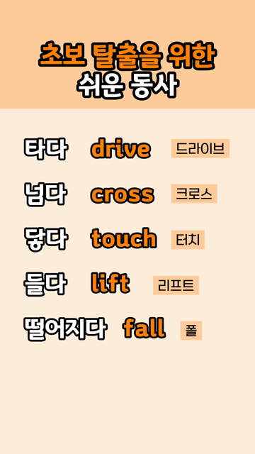 이 카테고리 글 더보기 왕초보가 외우기 좋은 기초 단어 영어 초보를 위한 여행 영어단어 영어초보 기초 생활 단어 영어초보를 위한 핵심 동사 모음 초보자가 알아야 할 기초영어 필수 동사 왕초보도 쉽게 배우는 기초 영어단어 초보를 위한 핵심 동사 모음 일상에서 자주 쓰는 기초 형용사 왕초보도 읽을 수 있는 쉬운 영어단어 영어초보가 먼저 외울 단어 이번주 Top 5 원어민이 매일 쓰는 10가지 영어문장 생활영어문장 관리자 - 2026-03-26 영어실력 향상을 위한 형용사 모음 동사/형용사 관리자 - 2026-03-27 다시 시작하는 영어 쉬운 형용사 왕초보단어 관리자 - 2026-03-26 잡화 관련 영어단어 모아보기 생활영어단어 관리자 - 2026-03-25 다시 도전하는 영어 쉬운 형용사 왕초보단어 관리자 - 2026-03-29 초보 탈출을 위한 쉬운 동사 왕초보단어 초보 탈출을 위한 쉬운 동사 타다 drive [드라이브]넘다 cross [크로스]닿다 touch [터치]들다 lift [리프트]떨어지다 fall [폴]