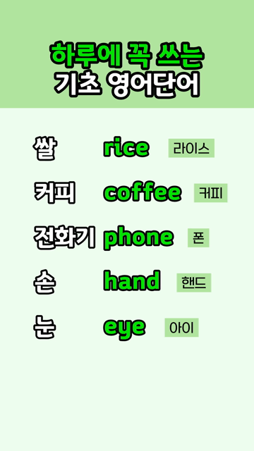 이 카테고리 글 더보기 아주 쉬운 영어 형용사 모음 바로 말할 수 있는 쉬운 영어단어 매일 쓰는 쉬운 영어단어 매일 쓰는 쉬운 영어 동사 다시 영어 시작하는 기초영어 필수단어 상태를 나타내는 참쉬운 형용사 영어초보 필수암기 생활 영어단어 초급자가 꼭 알아야 할 기초 생활영어 단어 이번주 Top 5 ~fy로 끝나는 영어단어 접두사/접미사 관리자 - 2026-03-25 하루에 꼭 쓰는 기초 영어단어 왕초보단어 관리자 - 2026-03-25 아주 쉬운 영어 형용사 모음 왕초보단어 관리자 - 2026-03-25 해외여행 가서 꼭 사용하는 여행영어 필수단어 여행영어단어 관리자 - 2026-03-25 기초부터 다시 정리하는 영어 필수 중학교 영단어 초등/중등 영단어 관리자 - 2026-03-25 하루에 꼭 쓰는 기초 영어단어 왕초보단어 하루에 꼭 쓰는 기초 영어단어 쌀 rice [라이스]커피 coffee [커피]전화기 phone [폰]손 hand [핸드]눈 eye [아이]