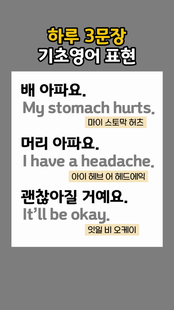 이 카테고리 글 더보기 영어 왕초보 한걸음 한걸음 왕초보를 위한 필수 생활영어 다시 시작하는 아주 쉬운 영어회화 기초영어회화 처음 배우는 영어 왕초보 영어 필수 영어문장 왕초보가 바로 쓰는 참쉬운 생활영어 영어 왕초보가 꼭 외워야하는 문장 하루3문장 아주 쉬운 표현 영어 왕초보 실전 영어표현 다시 시작하는 영어 아주 쉬운 문장 이번주 Top 5 종교 영어단어 한눈에 보기 생활영어단어 관리자 - 2026-03-26 축하 영어단어 모음 주제별 영단어 관리자 - 2026-03-25 ~ence로 끝나는 영어단어 접두사/접미사 관리자 - 2026-03-25 ~ology로 끝나는 영어단어 접두사/접미사 관리자 - 2026-03-27 음식 영어단어 모음 주제별 영단어 관리자 - 2026-03-25 하루 3문장 기초영어 표현 왕초보문장 하루 3문장 기초영어 표현 배 아파요.My stomach hurts.[마이 스토막 허츠] 머리 아파요.I have a headache.[아이 해브 어 헤드에익] 괜찮아질 거예요.It’ll be okay.[잇을 비 오케이]
