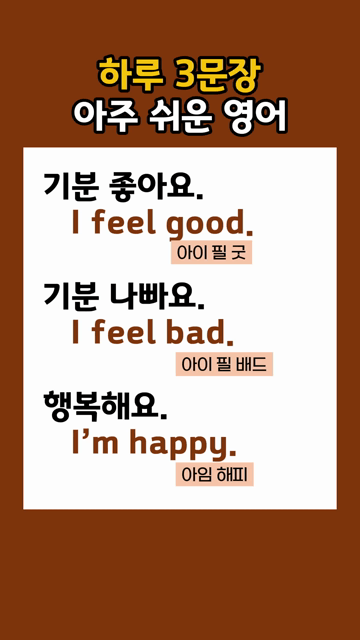 이 카테고리 글 더보기 영어회화 처음부터 차근차근 배우기 하루 3문장 기초영어 표현 다시 시작하는 기초 영어회화 영어 왕초보 오늘의 회화 초보영어회화 필수문장 배우기 기초영어회화 하루 3문장 다시 배우는 영어 기초문장 배우기 하루3문장 아주 쉬운 표현 이번주 Top 5 다시 영어 시작할 때 배워야 할 기초문장 왕초보문장 관리자 - 2026-03-25 영어초보 필수암기 성격표현 형용사 동사/형용사 관리자 - 2026-03-27 술집 관련 영어단어 모음 생활영어단어 관리자 - 2026-03-26 초보자가 알아야 할 기초영어 필수 동사 왕초보단어 관리자 - 2026-03-25 ~ence로 끝나는 영어단어 접두사/접미사 관리자 - 2026-03-25 하루 3문장 아주 쉬운 영어 왕초보문장 하루 3문장 아주 쉬운 영어 기분 좋아요.I feel good.[아이 필 굿] 기분 나빠요.I feel bad.[아이 필 배드] 행복해요.I’m happy.[아임 해피]