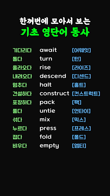 이 카테고리 글 더보기 매일 연습하는 기초 동사 모음 왕초보가 바로 쓰는 기초 영단어 동사 매일 쓰는 아주 쉬운 기초 영단어 동사 왕초보가 먼저 익히는 쉬운 영단어 동사 기초부터 차곡차곡 쌓는 쉬운 영단어 동사 기초회화에 꼭 필요한 쉬운 영단어 동사 기초영어 실력을 키우는 필수 영단어 동사 매일 연습하는 초간단 기초 영단어 동사 이번주 Top 5 쇼핑몰 영어단어 한꺼번에 보기 생활영어단어 관리자 - 2026-03-26 영어 초보도 쉽게 따라할 수 있는 표현 10개 생활영어문장 관리자 - 2026-03-25 음식 영어단어 한눈에 보기 생활영어단어 관리자 - 2026-03-26 세탁소 영어단어 모음 주제별 영단어 관리자 - 2026-03-26 다시 정리하는 중학교 실력 향상 영단어 초등/중등 영단어 관리자 - 2026-03-25 한꺼번에 모아서 보는 기초 영단어 동사 동사/형용사 한꺼번에 모아서 보는 기초 영단어 동사 기다리다 await [어웨잇]돌다 turn [턴]올라오다 rise [라이즈]내려오다 descend [디센드]멈추다 halt [홀트]건설하다 construct [컨스트럭트]포장하다 pack [팩]풀다 untie [언타이]섞다 mix [믹스]누르다 press [프레스]접다 fold [폴드]비우다 empty [엠티]