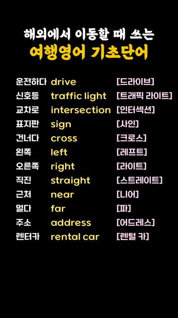 이 카테고리 글 더보기 해외로 여행 갔을 때 기본 대화에 필요한 단어 기초영어 여행영어 날씨 관련 단어 모음 해외여행가서 쇼핑할 때 알아두면 좋은 단어 해외여행 영어단어 음식 주문 관련 단어 해외여행 가서 사용하는 교통수단 이용 영단어 해외여행 숙소 예약 관련 영단어 해외여행 비행기 안에서 쓰는 여행영어 단어 모음 비상상황에서 필요한 여행영어 단어 모음 이번주 Top 5 다시 영어 시작하는 기초영어 필수단어 왕초보단어 관리자 - 2026-03-25 결혼 영어단어 모아보기 생활영어단어 관리자 - 2026-03-25 왕초보 영어 한걸음부터 시작하기 왕초보문장 관리자 - 2026-03-25 기초영어 여행영어 날씨 관련 단어 모음 여행영어단어 관리자 - 2026-03-25 Have you ever ~? 패턴영어 패턴영어 관리자 - 2026-03-25 해외에서 이동할 때 쓰는 여행영어 기초단어 여행영어단어 해외에서 이동할 때 쓰는 여행영어 기초단어 운전하다 drive [드라이브]신호등 traffic light [트래픽 라이트]교차로 intersection [인터섹션]표지판 sign [사인]건너다 cross [크로스]왼쪽 left [레프트]오른쪽 right [라이트]직진 straight [스트레이트]근처 near [니어]멀다 far [파]주소 address [어드레스]렌터카 rental car [렌탈 카]