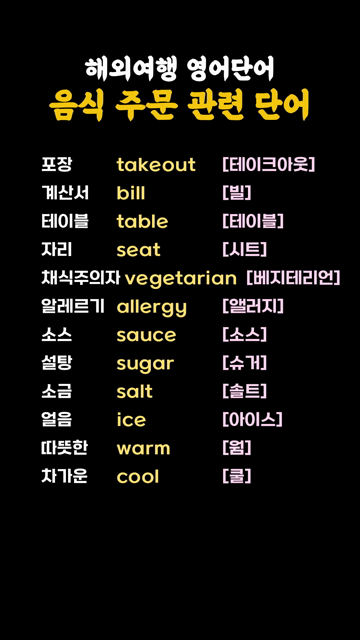 이 카테고리 글 더보기 해외로 여행 갔을 때 기본 대화에 필요한 단어 기초영어 여행영어 날씨 관련 단어 모음 해외여행가서 쇼핑할 때 알아두면 좋은 단어 해외여행 가서 사용하는 교통수단 이용 영단어 해외여행 숙소 예약 관련 영단어 해외여행 비행기 안에서 쓰는 여행영어 단어 모음 비상상황에서 필요한 여행영어 단어 모음 해외 관광지에서 자주 사용하는 영단어 이번주 Top 5 해외 관광지에서 자주 사용하는 영단어 여행영어단어 관리자 - 2026-03-25 Please say ~ 패턴영어 패턴영어 관리자 - 2026-03-25 해외 쇼핑할 때 쓰는 여행영어 단어 모음 여행영어단어 관리자 - 2026-03-25 다시 시작하는 영어 중학교 핵심 영단어 초등/중등 영단어 관리자 - 2026-03-25 해외여행가서 쇼핑할 때 알아두면 좋은 단어 여행영어단어 관리자 - 2026-03-25 해외여행 영어단어 음식 주문 관련 단어 여행영어단어 해외여행 영어단어 음식 주문 관련 단어 포장 takeout [테이크아웃]계산서 bill [빌]테이블 table [테이블]자리 seat [시트]채식주의자 vegetarian [베지테리언]알레르기 allergy [앨러지]소스 sauce [소스]설탕 sugar [슈거]소금 salt [솔트]얼음 ice [아이스]따뜻한 warm [웜]차가운 cool [쿨]