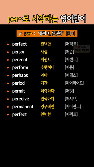 이 카테고리 글 더보기 ~able로 끝나는 영어단어 super~로 시작하는 영어단어 ~some 으로 끝나는 영어단어 sub~로 시작하는 영어단어 ~ed로 끝나는 영어단어 over~로 시작하는 영어단어 ~ality로 끝나는 영어단어 under~로 시작하는 영어단어 이번주 Top 5 기초부터 차곡차곡 쌓는 쉬운 영단어 동사 동사/형용사 관리자 - 2026-03-26 영어초보 필수암기 기초 영어 구동사 (숙어) 구동사(숙어) 관리자 - 2026-03-25 원어민 억양에 가까워지는 생활영어 10문장 생활영어문장 관리자 - 2026-03-26 주식 영어단어 한눈에 보기 생활영어단어 관리자 - 2026-03-26 사물묘사 영어단어 모음 주제별 영단어 관리자 - 2026-03-26 per~로 시작하는 영어단어 접두사/접미사 per~로 시작하는 영어단어 📌 per~ : ‘통하여, 완전히’ [퍼~] 🔸 perfect 완벽한 [퍼펙트]🔸 person 사람 [퍼슨]🔸 percent 퍼센트 [퍼센트]🔸 perform 수행하다 [퍼폼]🔸 perhaps 아마 [퍼햅스]🔸 period 기간 [피어리어드]🔸 permit 허락하다 [퍼밋]🔸 perceive 인식하다 [퍼시브]🔸 permanent 영구적인 [퍼머넌트]🔸 perfect 완벽한 [퍼펙트]